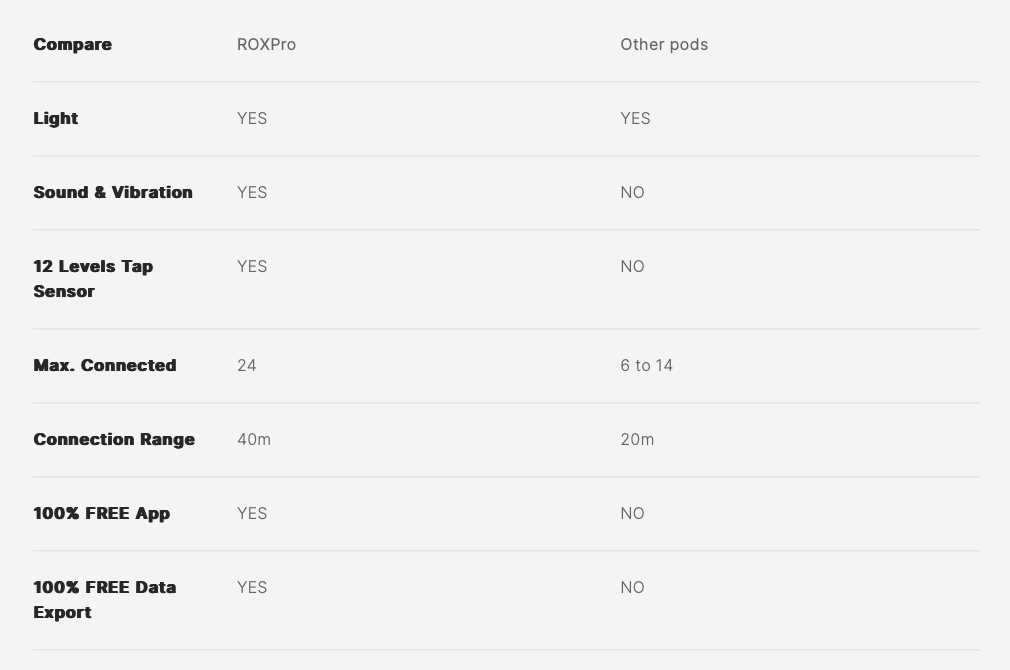 ROX has sound, which develops acoustic perception and also vibration. For example, when using the balance feature, it gives the person instant feedback when unbalancing by vibrating.It also has a stronger connection between the ROX and the mobile allowing up to 80m, and a connection of up to 24 devices compared with a maximum of 12 from the competitors.The tap sensor of ROX and ROXPro has 12 levels of sensitivity that lets you decide if you want a gentle touch or a punch
