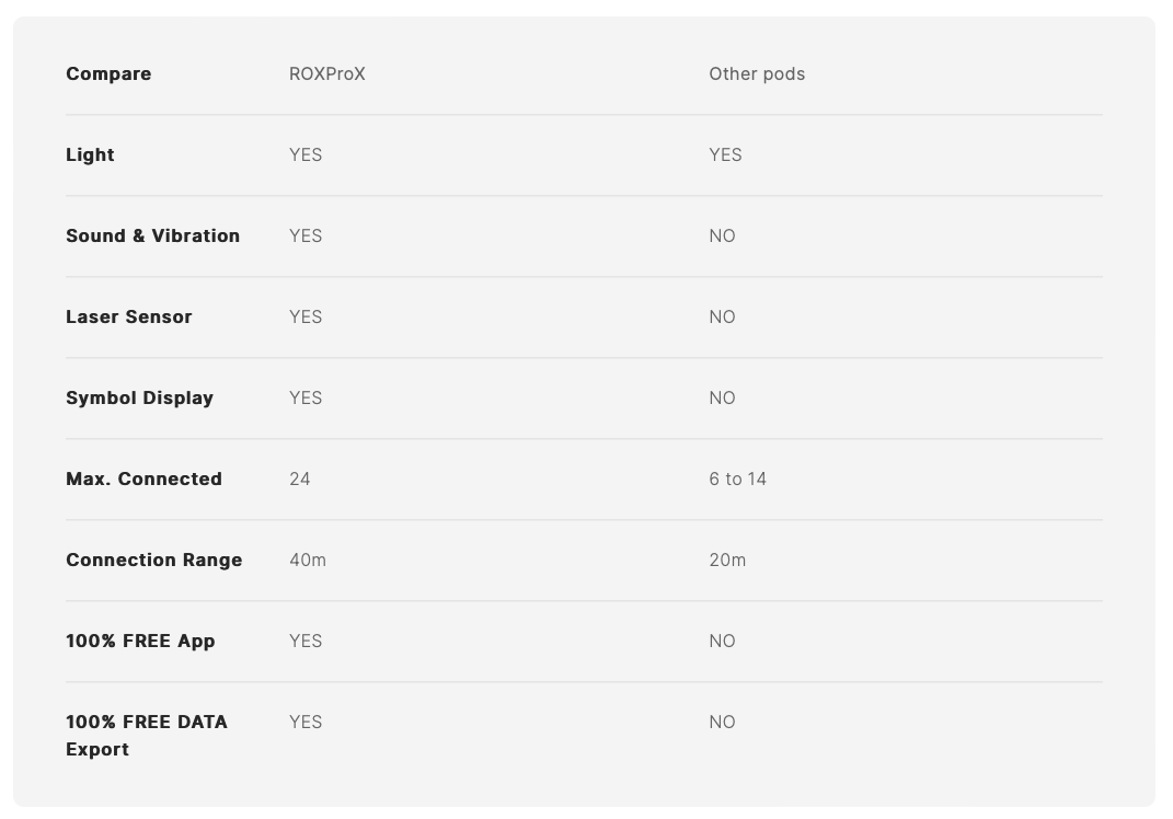 ROX has sound, which develops acoustic perception and also vibration. For example, when using the balance feature, it gives the person instant feedback when unbalancing by vibrating.It also has a stronger connection between the ROX and the mobile allowing up to 80m, and a connection of up to 24 devices compared with a maximum of 12 from the competitors.The tap sensor of ROX and ROXPro has 12 levels of sensitivity that lets you decide if you want a gentle touch or a punch